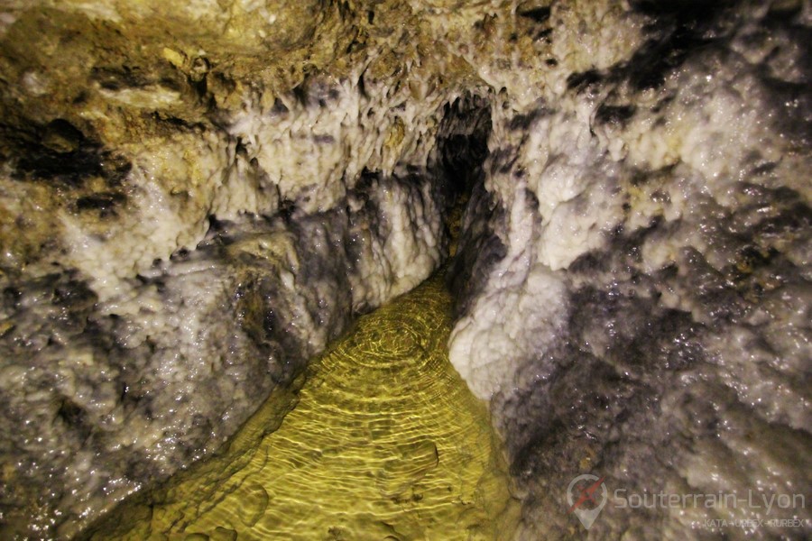 Au fur et à mesure de ma progression dans la galerie principale, cette dernière évolue progressivement. Les murs en pierres dévoilent de magnifiques concrétions qui elles aussi laissent progressivement place à des murs simplement creusés dans la terre. Finalement, je débouche dans une petite cavité et découvre la fameuse source.